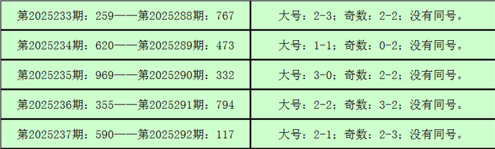 统计3D历史上已开出的奖号发现,在运动5期开奖号码中:3D在第2025233期-第2025237期辞别开出奖号:259-620-969-355-590。