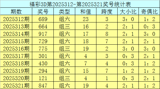开奖回顾:福彩3D第2025321期奖号:847。