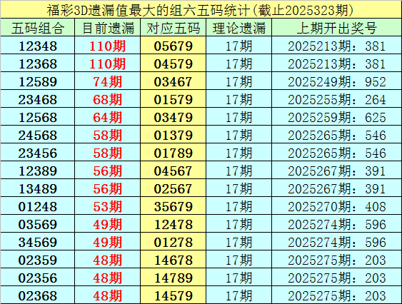 4.放肆第25323期,五码组六遗漏最大的是:12348、12368,刻下遗漏110期。本期这2个五码解冻的可能性较小,则对应五码中可能齐会开出奖号。