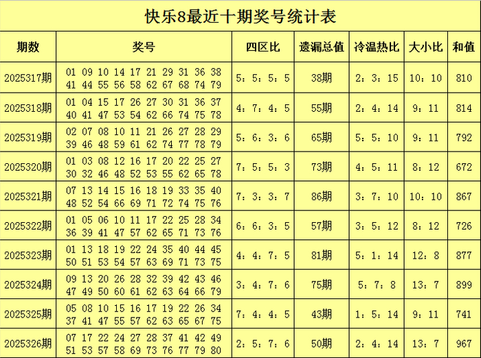 福彩同意8第2025326期开奖总结:07 17 22 24 27 28 37 41 42 49 51 53 57 58 69 73 76 77 79 80,其中奖号四区比为2:5:7:6山东欧佩克润滑油有限公司,遗漏总值为50,大小比为13:7,012路比为6:9:5,和值为967。