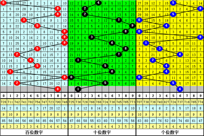 百位分析:该位上期奖号为2,出现2路、偶数、小 号,在前11期奖号,该位012路比为4:2:5,1路号码走冷,现在012路号码遗漏期数别离为1、2和0,近期百位细心2路号码走热。
