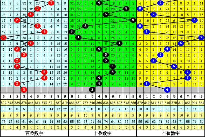 在历史同时号码中,组选0-9号码出现次数为:1出现3次,号码0、3、5出现5次,号码2出现7次,号码7、9出现8次,号码4出现9次,号码6、8出现11次,本期参考号码3。